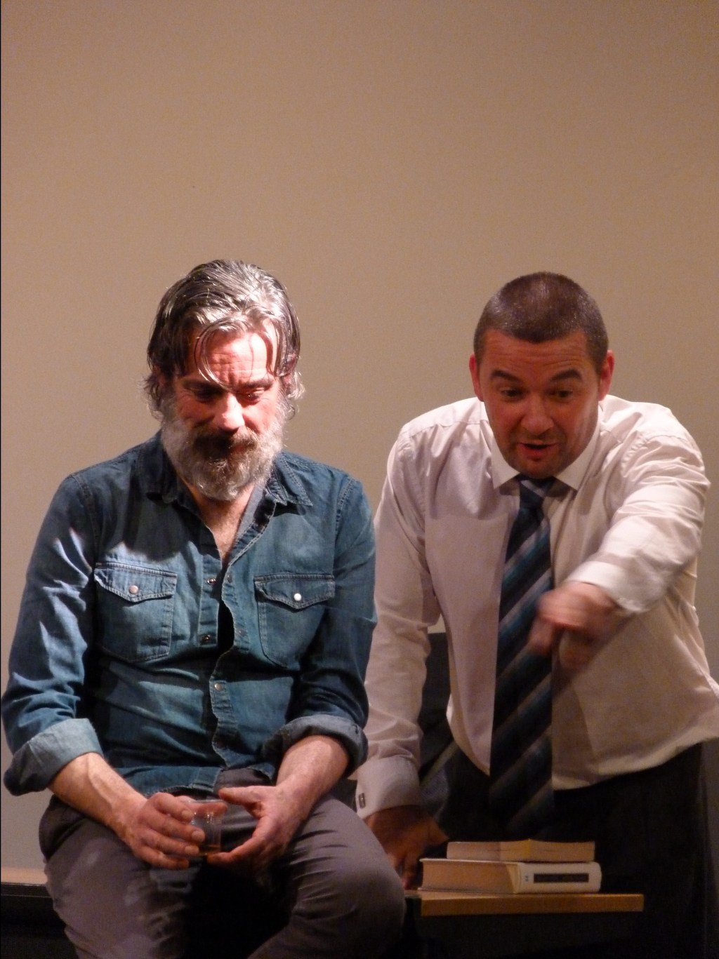 Montague’s tightly written script carries a powerful emotional punch. On the surface it is about two men, who have been close childhood friends, reluctantly talking. The Butcher Molloy is more searching than that and even though this two-hander is set in a doctor’s consulting room, it is action packed. We meet Martin The Butcher Molloy, and Professor Oliver Keating (Ollie), when Molloy attends Ollie’s surgery. Molloy is very anxious about his health, but Ollie informs Molloy, with excellently timed deadpan humour, that the blood that he thought was in his stools were red peppers. I really admire how Montague, the writer, allows the 2 characters to evolve. I enjoy how the play is sensitively acted by John O’Dowd, who is arresting as Martin The Butcher Molloy, and Conor Montague, who rewards us with an understated performance as Professor Oliver Keating. O’Dowd and Montague peel away the layers to reveal what is really going on; sometimes it is brutal and other times gentle. The pace is finely tuned; you can feel the air shift at key moments in the play.