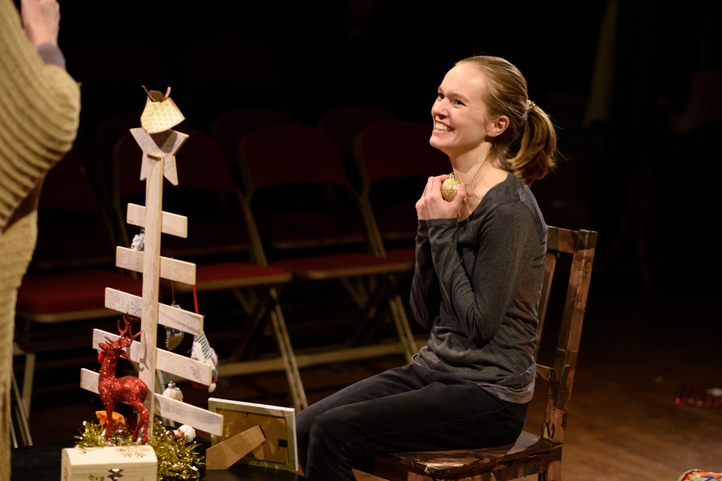 The set is sparse and occasionally awkward. When the action takes place at the sides it can be hard for the audience to see it properly. But the device of using the Christmas lights works well throughout and brings a sense both of festive cheer and circularity to the play. Sometimes it did feel as if the actors – particularly Ma were acting for a bigger stage than the one this piece was set on. They were projecting to a back row that was a lot further back than anyone was– and these slightly actorly mannerisms distracted slightly. Equally, the first half was too long at 90 minutes – and sagged as a result.