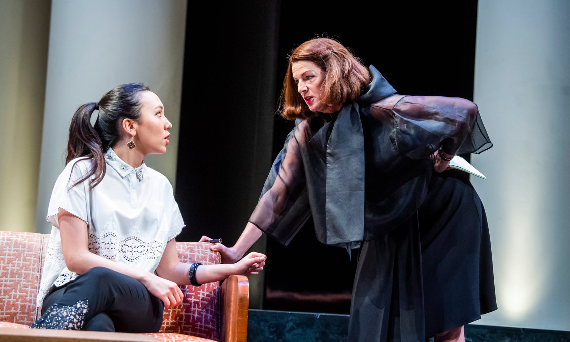The comedy, the satire, the comment on society is just weird; racism towards Yung Kim Li (Ionna Kimbrook, who deserves better from her West End debut,in a role lacking substance) a young Korean actress who he constantly confuses her race with the Chinese and struggles with her English born/educated ways (the constant references to Kent from Americans are weird; do they know where Kent is. Racism towards immigrants and Fein’s support of them when it infringes on his personal life.