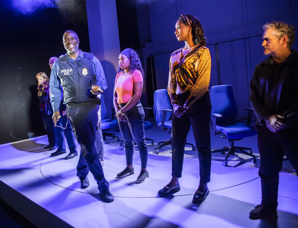 Verbatim plays can often feel static with a view of just letting the words do the work, but Baker’s direction and Pankhurst’s movement really lift the words off the page and allow these experiences to feel live without always being literal. A slick ensemble fizz and pop into different people, memories, and settings. We are led on this journey through Curtis (Nicholas Beveney), our ICE (Immigration and Customs Enforcement), cool officer as he moonwalks, lip syncs, charms and commands the stage. Our MC is reminiscent of the Joker within Theatre of the Oppressed, building rapport with the audience, pointing out our own privilege, but whose side is he on? It’s not that he doesn’t care, but as an ICE officer, we are constantly reminded that he’s just there to enforce the rules. He didn’t set out to be that way, and just sort of fell into it…well we’ve all got bills to pay.